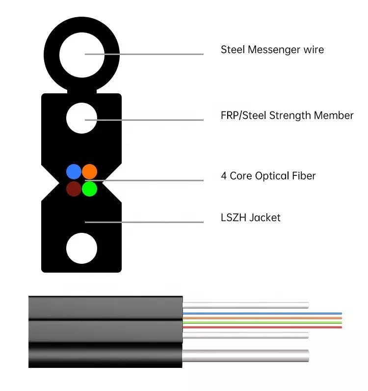 FTTH 케이블은 직접적으로 그들의 집들에 연결되었습니다, 그들의 대역폭, 사고 방식과 전송 기술 유형이 제한되지 않습니다. 광섬유 유니트 고유 번호는 센터에서 배치했습니다. 두개의 평행한 강도 부재는 양측에 위치합니다. 추가적 강도 부재로서의 강선은 또한 적용됩니다, 그리고 나서, 더 케이블이 검은 LSZH 덮개로 완료됩니다.